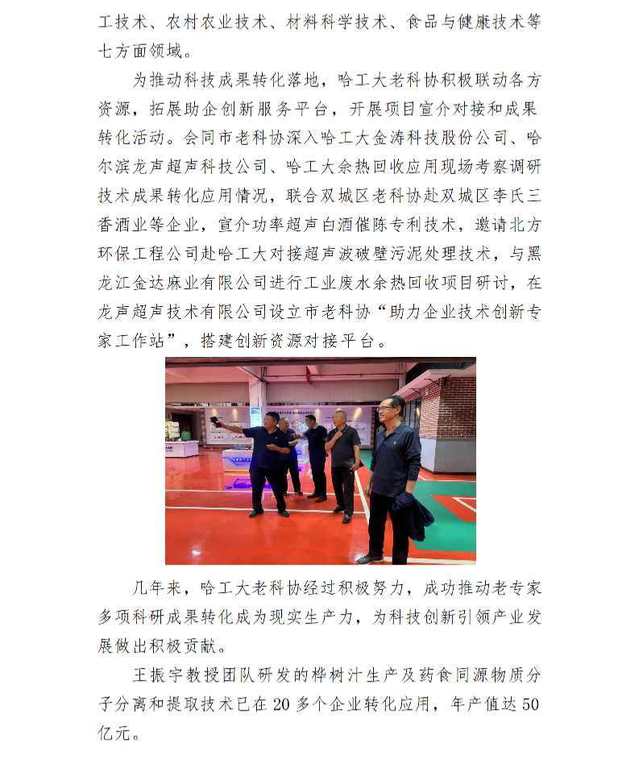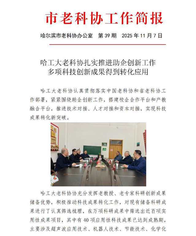 我校老科协持续推进助企创新工作,取得显著成效,获得哈尔滨市老科协等上级单位关注和肯定。11月7日,市老科协以《哈工大老科协扎实推进助企创新工作,多项科技创新成果得到转化应用》为题,专门刊发了今年第39期简报给予介绍。