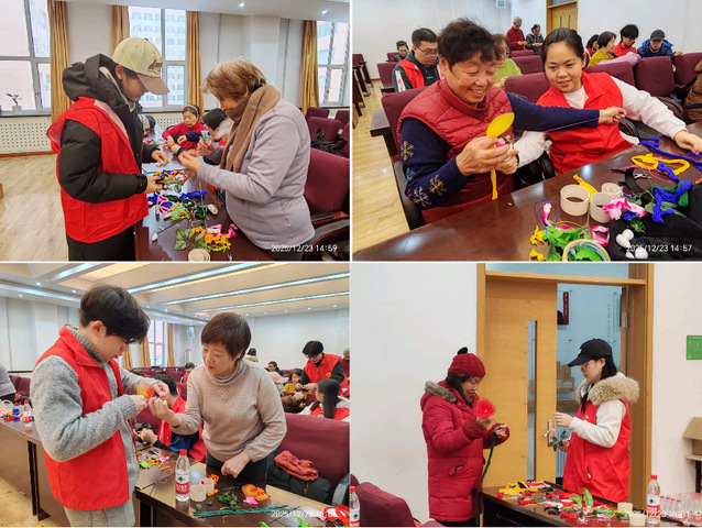 活动现场,志愿者与老同志们分组结对,穿丝、缠绕、打结、塑形,大家一边切磋创作技巧,一边畅谈老同志们教书育人的难忘岁月与退休生活趣事,欢声笑语充盈一室。志愿者全程贴心陪伴,主动协助行动不便的老同志裁剪材料、解决难题。窗外瑞雪飘飘,室内温情融融,银发与青春相映,勾勒出校园里美丽的敬老风景线。