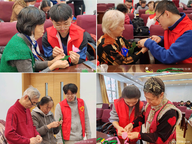 为深入贯彻落实积极应对人口老龄化国家战略,弘扬孝亲敬老传统美德,丰富离退休教职工精神文化生活,12月23日下午,由离退休工作处主办、化工与化学学院协办、校青年志愿者协会及数学学院青年志愿者协会参与服务的 “孝亲敬老·指尖生花”丝网花制作活动在活动中心331室温情启幕。