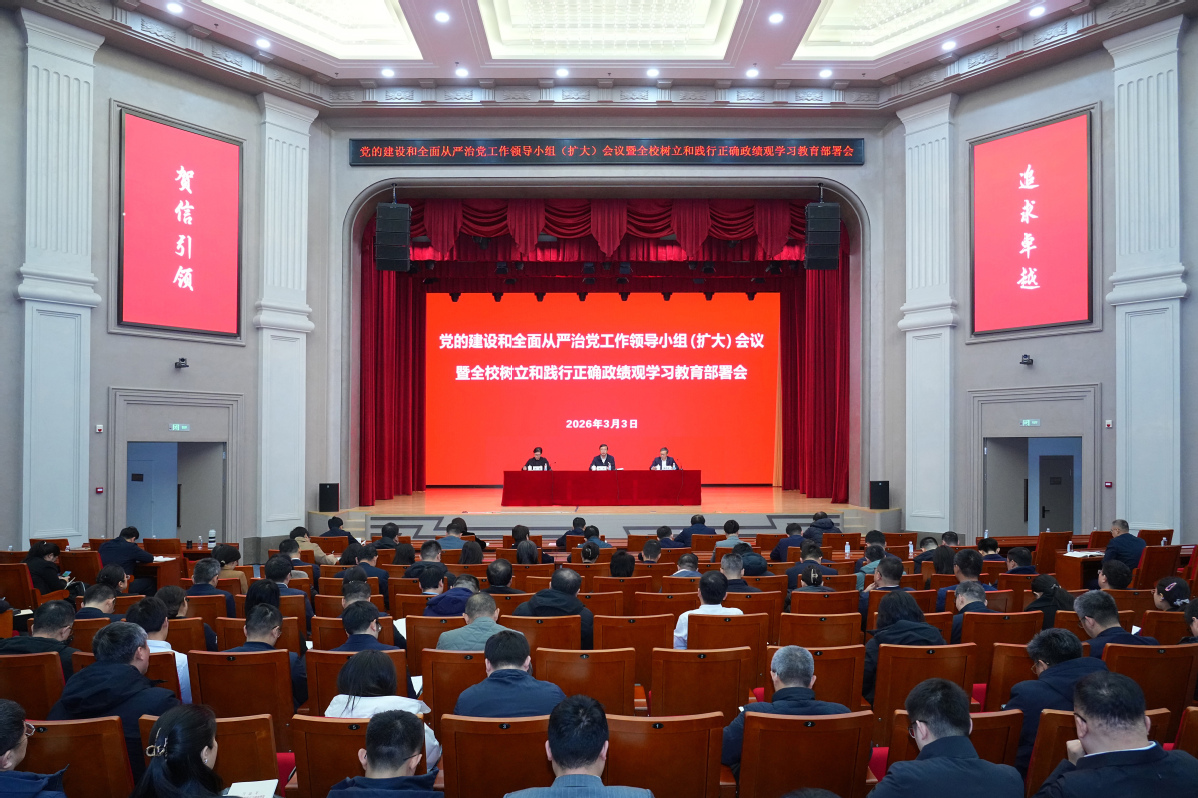 哈工大全媒体(阚思邈/文 辛然 隗海燕 金淑芳/图)3月3日,学校召开党的建设和全面从严治党工作领导小组(扩大)会议暨全校树立和践行正确政绩观学习教育部署会,深入学习贯彻习近平总书记关于树立和践行正确政绩观学习教育的重要讲话和重要指示精神,传达学习中央党的建设工作领导小组会议精神和《中共中央办公厅关于在全党开展树立和践行正确政绩观学习教育的通知》文件精神,落实工业和信息化部党组有关工作要求,对全校开展树立和践行正确政绩观学习教育工作进行全面动员部署。校党委书记陈杰主持会议并讲话。校党委常委、校长韩杰才出席会议并传达相关精神。校党委常务副书记孙雪介绍《中共哈尔滨工业大学委员会关于开展树立和践行正确政绩观学习教育实施方案》。
